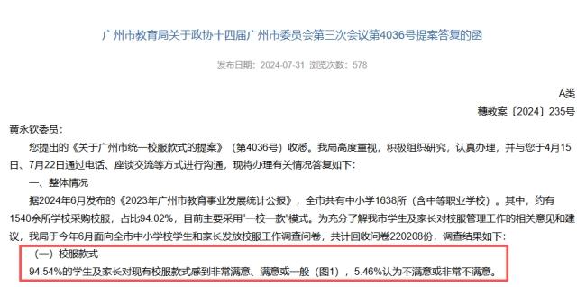 2024年7月のCCPPCC提案第4036号に対する広市教育局の回答书では、一连の调查データが「1校1モデル」モデルが社会的に受け入れられていることを明确に示している。据统计,全市1638所中小学校(含中小学校)中,94.02%乌丁职业学校)实行了统一制度。根据220208份有效调查问卷,94.54%的学生和家长对现有校服款式表示“非常满意”、“满意”或“一般”,只有5.46%的学生和家长表示不满意。 92%的人认可校服的质量,只有8%的人不满意。 70.14%的人认为价格合理,大多数家庭都能承受。