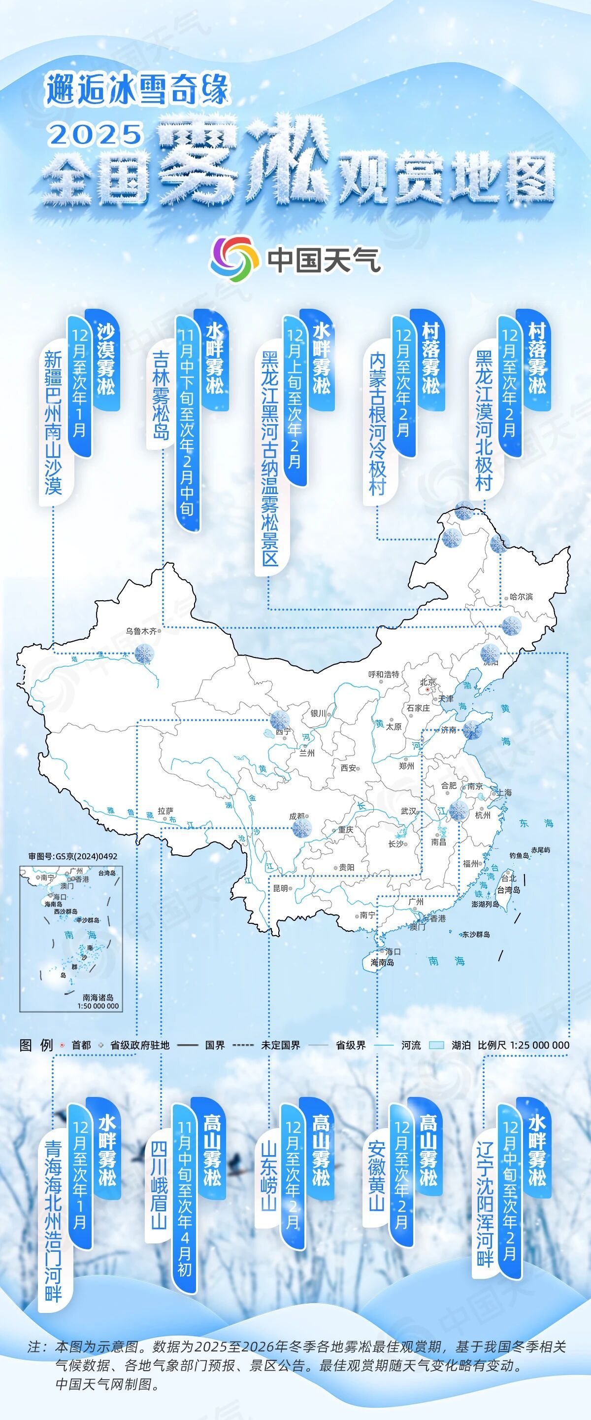 当寒冷季节到来,低温遇到水蒸气时,水蒸气凝结成霜,这是冬季罕见的奇观。目前,我国南北地区正处于霜冻高峰期。中国天气网发布全国冰雪地图,带你踏上童话版冰雪之旅,限时开放海岸、小镇、山地、沙漠四大冰雪秘境。霜冰,俗称冰花或树倒,是由空气中过饱和水蒸气凝结而成。霜轻如柳,白如玉。走进去,让人感觉仿佛置身于童话世界。您是否知道,不仅在水岸、城镇和山区,而且在沙漠中也可以找到被霜覆盖的树木?资料来源:Cue中国天气网官方微信公告 从中国天气网发布的全国霜冻树木图来看,霜树有明显的季节性,最佳观赏时间主要是12月至次年2月。北方冬季寒冷,霜冻在新疆、青海、内蒙古、黑龙江、吉林、辽宁、山东等地广泛分布。在南方,霜冻多隐藏在云雾缭绕的山峰后面,如安徽黄山、四川峨眉山等。水边霜:波光粼粼的水波。河两岸盛开着水晶花。东北地区是霜冻稳定发生的最佳地区。除了寒冷的气候外,晴朗无云的天空也有利于夜间地表热量的消散,从而使清晨温度达到最适合结霜的临界点。更独特的是吉林省吉林市的雾凇岛、黑龙江省黑河市的古纳温雾凇风景区,还有水辽宁省沉阳市洪河河水终年不结冰,即使在冬季也是如此。源源不断的水蒸气遇到凝结,加上平静无风的环境,营造出“万树梨花开”的冬季景象。上述三个地方的最佳观霜时间为11月中旬、12月初、12月中旬,最佳观霜时间为次年2月。 2025年2月5日,沉阳洪河上越冬的候鸟嬉戏觅食,岸边白霜止有梦(蔡景宇/视觉中国/版权图片来源视觉中国)青海省海北藏族自治州门源县,浩蒙河蜿蜒如巨龙,河两岸灌木茂密。未完全冻结的河水可以提供充足的水蒸气。 12月至1月,大概率能看到罕见景观树木被霜覆盖。村庄被霜覆盖。银色的树枝周围烟雾缭绕,森林里开满了美丽的花朵。宣和,内蒙古最北端的城市,素有“中国冷极”之称。冬天的最低气温通常在-40摄氏度左右,冷到水会结冰。 Lengi 村的冬季严酷而漫长,最佳霜冻季节是 12 月至 2 月。当霜出现的时候,玉树和厨房的烟雾收缩了,营造出一种类似于烟花的独特气氛。 2020年11月11日,内蒙古自治区元和市北极村出现霜冻景象。 (王福宇/视觉中国/版权图片来源:视觉中国)黑龙江省漠河的北极村也因严寒而闻名。由于其独特的地理位置和气候条件,每年霜冻发生的频率都比较高。树枝上挂着蓬松的霜es和附着在白色的雪上看起来就像童话故事里的东西。当地的树木在 12 月至 2 月期间霜冻最为茂盛,是一年中最神奇的时节。高山霜:山峰如云,万树绽放,霜不仅仅出现在水边的某些地方。您还可以在村庄和山顶上看到白色的瓜花。山东崂山、安徽黄山、四川峨眉等地海拔高、气温低、水汽丰富,是观霜胜地。 12月至次年2月是崂山、黄山观赏霜树的最佳时间。选择晴朗、微风的日子攀爬也是一个好主意。漫山遍野,随处可见冬天的风景。 2025年1月27日,安徽黄山光明顶天空晴朗,透过霜冻可以看到远处的山峦。 (签名贡献者/视觉中国/图片来源版权视觉中国)峨眉山雾凇的观赏时间较长,从11月中旬到次年4月初。冬日清晨,当雾气渐渐散去,峨眉山间,放眼望去,尽是冰冻的“玉树鲜花盛开的春景”。沙漠雾凇:霜冻 沙海覆盖着银色的铠甲。一提到霜,很多人的脑海中就会浮现出木栈道上的霜、山间玉石的画面。很少有人知道,新疆维吾尔自治区宾果岭蒙古自治州博湖县的南山沙漠,也隐藏着冰雪的惊喜。这片沙漠位于博斯滕湖附近。 12月至明年1月整个月,夜间地表温度迅速下降。当寒冷干燥的空气遇到博斯腾湖的水蒸气时,就能在沙海上方凝结成云,形成沙漠霜冻的奇景。 2021 年 12 月 4 日新疆南山沙漠出现冰冻景观。 (王健/视觉中国/版权图片来源:视觉中国)然而,在气候干燥的沙漠中,霜树景观相对较少,而且由于沙漠昼夜温差较大,黎明后气温上升较快,霜树往往会很快融化。霜看起来像雪但不是雪,看起来像冰但不是冰。它的形成条件十分严酷且罕见。中国气象网温馨提示,霜冻通常伴随着雪和雾出现。去湖泊、河流、山地等地方时,要穿防滑鞋,最好戴防护眼镜,这样可以有效减少紫外线和冷风对眼睛的伤害。另一方面,气温较冷,要准备好御寒衣物,如羽绒服、帽子等、手套、围巾等,并采取一切必要的防护措施。让自己远离寒冷,享受舒适的旅行。